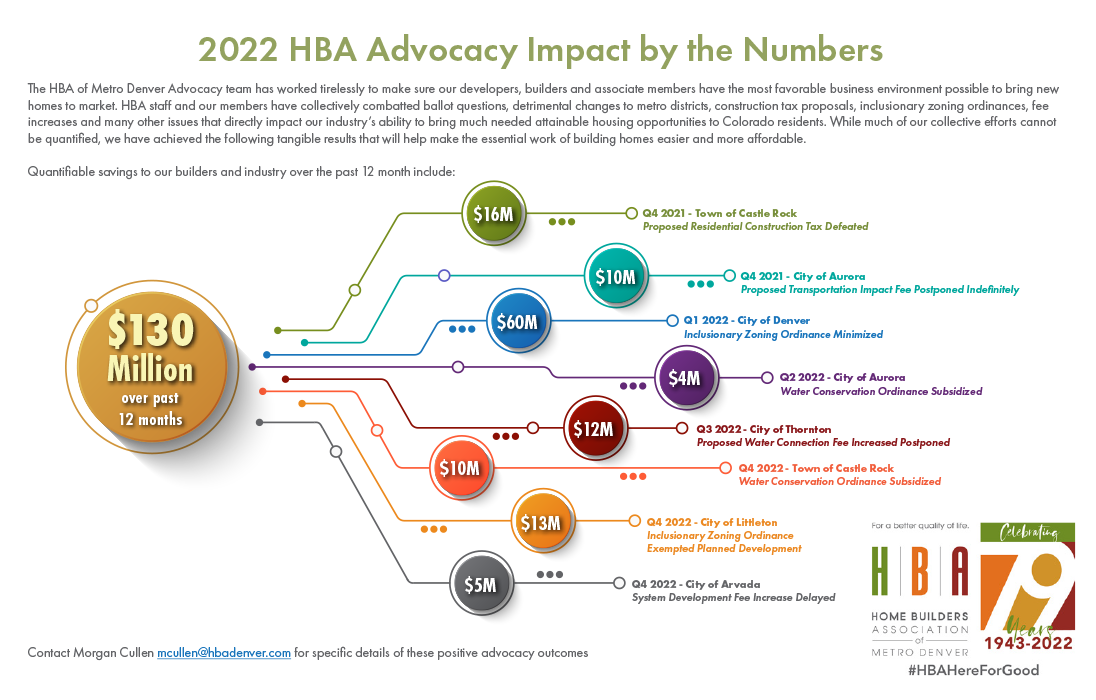Throughout last year, The HBA of Metro Denver Advocacy team has worked tirelessly to make sure developers, builders and associate members have the most favorable business environment possible to bring new homes to market. The HBA of Metro Denver staff and our members have collectively combatted ballot questions, detrimental changes to metro districts, construction-tax proposals, inclusionary-zoning ordinances, fee increases and many other issues that directly impact our industry's ability to bring much-needed attainable housing opportunities to Colorado residents. While much of our collective efforts cannot be quantified, we have achieved the following tangible results that will help make the essential work of building homes easier and more affordable.
