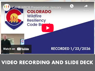 Colorado Wildfire Resiliency Code Board Presentation Recording. Click to view recording Joe Loidolt, President of Classic Homes presented this Colorado Wildfire Resiliency Code Board presentation to the Colorado Association of Home Builders (CAHB) Board January 23, 2026. Full WRC slide presentation can also be downloaded.